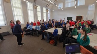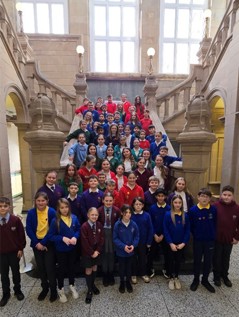 Arweiniodd y Mei Gwynedd dalentog weithdy ysgrifennu gyda’r myfyrwyr yn sesiwn Cyngor Mawr y Plant yn y Swyddfeydd Cyffredinol i greu cân am Flaenau Gwent.