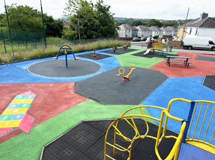 Yn y llun mae ardal chwarae wedi'i hadnewyddu yng Nglyncoed, Glynebwy.