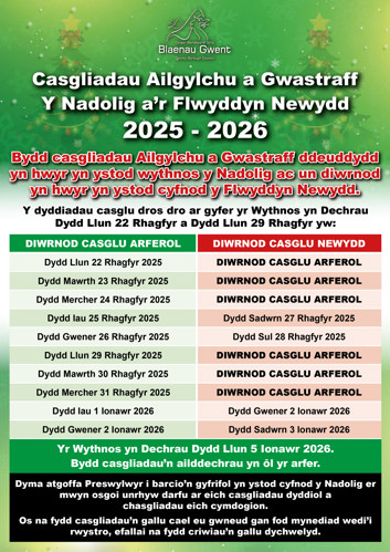 Yr Wythnos yn Dechrau Dydd Llun 5 Ionawr 2026. Bydd casgliadau’n ailddechrau yn ôl yr arfer.