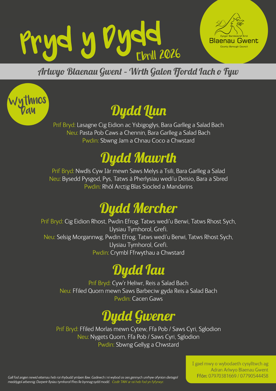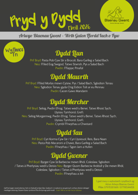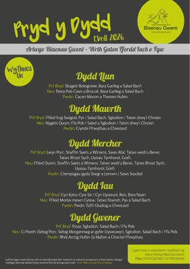 Mae bwydlenni y dydd ar gyfer: