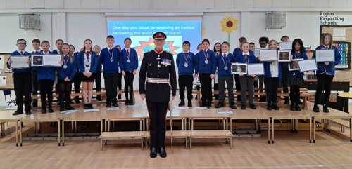 The culmination of the programme was an inspiring investiture ceremony, where children from Dosbarth Aur presented their learning to family members and the wider school community. Brigadier Robert Aitken CBE, HM Lord-Lieutenant of Gwent attended as the esteemed guest and presented the awards to those pupils who completed all four modules of the School Honours Programme. The ceremony featured AI-generated images of the children’s future selves, adding a creative and forward-looking dimension to the event.