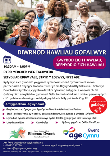 Rydym yn estyn gwahoddiad cynnes i chi ymuno ag Age Cymru Gwent mewn partneriaeth â Chyngor Blaenau Gwent yn ein Digwyddiad Diwrnod Hawliau Gofalwyr. Dewch draw i ymlacio, cysylltu a dathlu'r cyfraniad amhrisiadwy rydych chi fel Gofalwyr yn ei wneud i'ch anwyliaid a'r gymuned. Gellir trefnu cludiant i chi a'r sawl sy'n derbyn gofal i gyrraedd y digwyddiad - felly peidiwch â cholli allan!