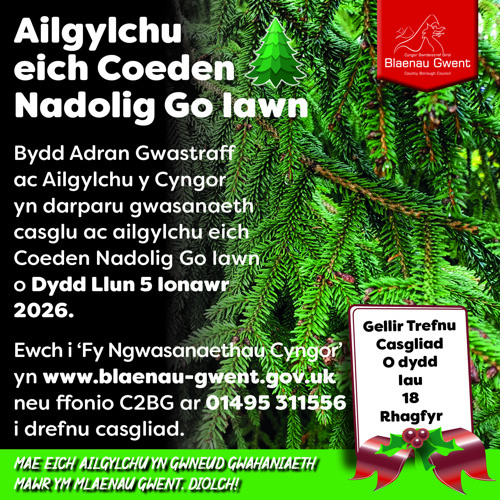 Bydd Adran Gwastraff ac Ailgylchu y Cyngor yn darparu gwasanaeth casglu ac ailgylchu eich Coeden Nadolig Go Iawn o Dydd Llun 5 Ionawr 2026.